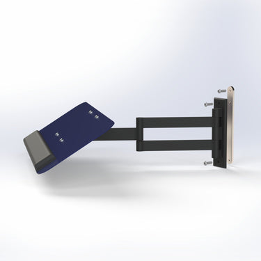 Our Keyboard Mounting Bracket fits to the Monitor Rail using sliding inserts, giving variable height options. The articulating bracket allows multi-positioning, including being able to move the keyboard away from the work area.